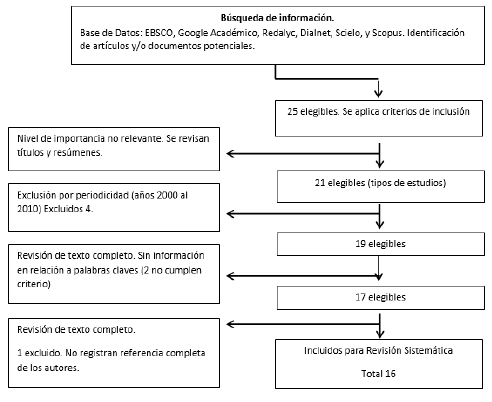 Por otra parte, los criterios de exclusión permitieron obviar documentos, artículos y tesis, encontrados en diferentes buscadores académicos donde la información no es relevante en su contenido; así también, aquellos artículos publicados entre los años 2000 hasta 2010; además, se prescindió de artículos cuyas palabras clave no fueron significativas para el enfoque de la investigación.