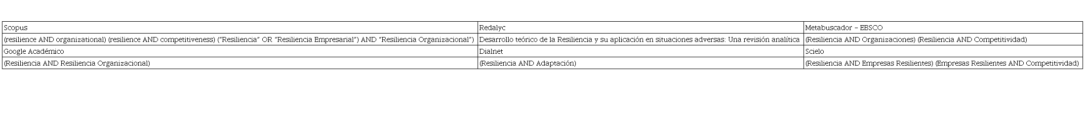 La información obtenida se consolidó en una matriz de antecedentes; en cuanto a la estrategia de búsqueda, las palabras clave fueron: Resiliencia, Supervivencia, Competitividad Empresarial, y Crecimiento. Para el proceso, se consideraron como descriptores los siguientes términos y a partir de la pregunta de investigación “resilience”, “competitiveness”, “business competitiveness”. Las rutas específicas se describen en el Cuadro 1.