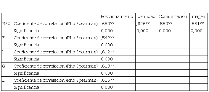 Asimismo, dentro de Posicionamiento, el componente identidad con un Rho de Spearman de ,626 tiene una mejor relación con la Responsabilidad Social Universitaria, por lo que a mayor identidad mejor será la Responsabilidad Social Universitaria, concordando con Dąbrowski et al. (2018); y, Mendoza et al. (2020, quienes señalaron que cada día las universidades están mostrando interés por los impactos que sus actividades generan en la sociedad, muchas veces utilizando herramientas muy similares a la experiencia de las empresas; como informes no financieros, sitios web, u otros medios que permitan el posicionamiento en la mente de los usuarios, es decir dejar marcada la imagen de la institución en el subconsciente colectivo.