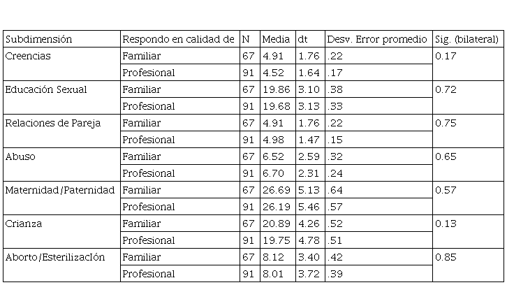 También, se encontró que tanto los familiares como los profesionales tienen una actitud más conservadora con respecto a las actitudes generales evaluadas por el cuestionario, existiendo una pequeña variabilidad si se comparan ambos grupos según las subdimensiones evaluadas por la escala, puesto que en dos ítems de actitudes de la subdimensión “Crianza”, mostraron diferencias estadísticamente significativas (p < 0.05).