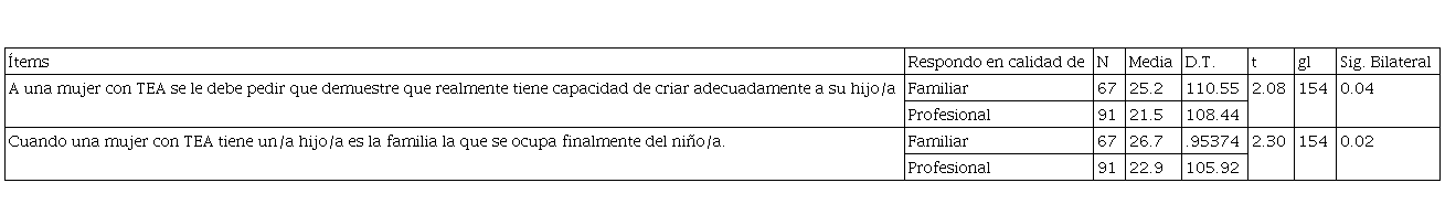 Sin embargo, al aplicar la prueba T de comparación de medias para muestras independientes entre familiares y profesionales a todos los ítems por separado se encontró diferencias significativas (p < 0.05) en los siguientes ítems que hacen referencia: “A la mujer con TEA se le debe pedir que demuestre que realmente tiene capacidad de criar adecuadamente a su hijo/a”, y “Cuando una mujer con TEA tiene un/a hijo/a es la familia la que se ocupa finalmente del niño/a” (ver Tabla 2).