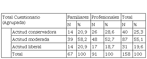 En este estudio los familiares respondieron con una distribución del 20% con actitudes conservadoras vs un 28,6% de profesionales; un 58,4% con actitudes moderadas de familiares vs un 52,7% de profesionales y un 21,5% con actitudes liberales por parte de familiares vs un 18,7% de profesionales, sin embargo, no se han hallado diferencias estadísticamente significativas entre ambos grupos por cada subdimensión.