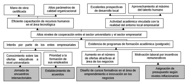 Utilizando la técnica del árbol de problemas y transformándolo en árbol de objetivos, se evidencian las condiciones positivas que se estiman sean las deseadas y viables a ser alcanzadas. Se detalla una primera aproximación a la lógica de la búsqueda de soluciones, mediante la definición de alternativas para ello. Éstas no se materializan en la ejecución del plan, sino que sirven de insumos para la aplicación posterior de la noción estratégica. Se especifica el objetivo central de planificación referido a ubicar “Altos niveles de cooperación entre el sector universitario y el sector empresarial” en el área de estudio, direccionado hacia el logro de objetivos tales como la “Eficiente capacitación de recursos humanos” y “Actividad académica vinculada con la realidad del entorno local empresarial” (ver Figura I).