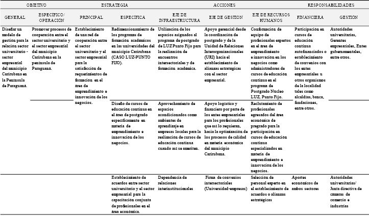 Precisamente el diseño de un programa de formación para el emprendimiento en el área de los negocios surge como estrategia de acción a seguir, considerando procesos de cooperación intersectoriales, redimensionamiento de los programas académicos universitarios, integrando talentos, espacios y recursos, entre otros procesos indispensables para el logro de los objetivos formulados (ver Cuadro 2).