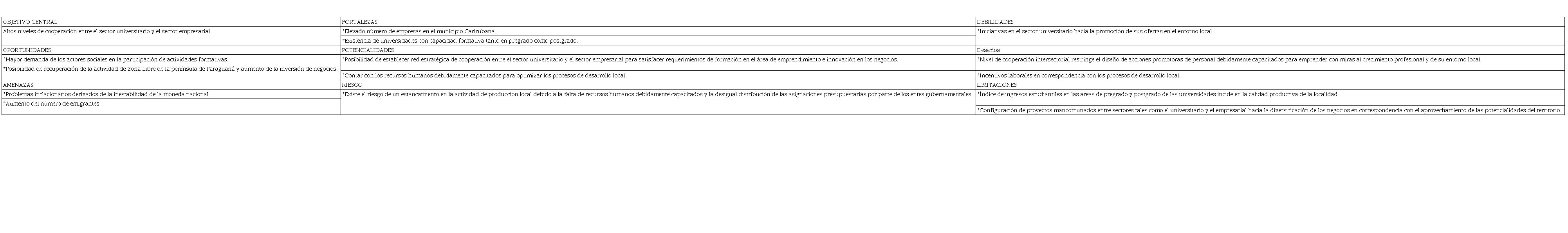Tomando como referencia información recopilada de la Fundación para el Desarrollo de la Región Centro Occidental de Venezuela (FUDECO, 2004); de la Corporación para la Zona Libre para el Fomento de la Inversión Turistica en la Península de Paraguaná (CORPOTULIPA, 2016); aportes de Acosta, Padilla y Perozo (2012); entrevistas a la coordinación de la unidad de relaciones interinstitucionales y de investigación y postgrado de la institución focalizada; al presidente y asesores ejecutivos de la Cámara de Industria y Comercio de Paraguaná (CACOINPAR); así como de la información recopilada en encuestas abiertas suministradas en una jornada sobre emprendimiento e innovación realizada con actores locales; a continuación se describen los siguientes aspectos importantes de resaltar: