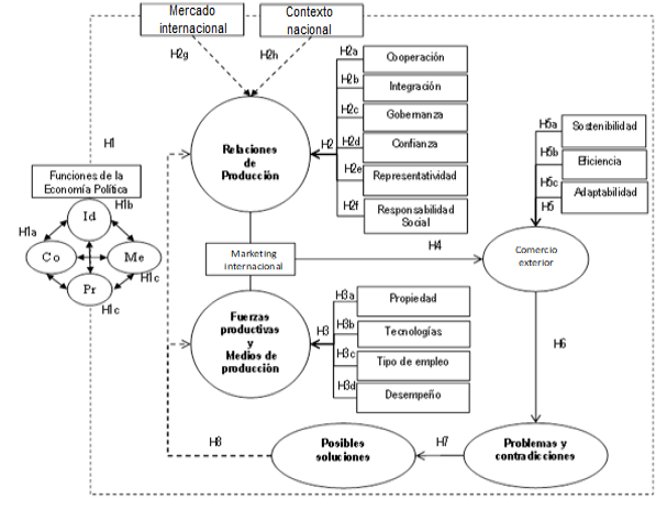 De este análisis teórico se deriva que: H1: Las funciones de la economía política impactan positivamente en las relaciones entre el marketing internacional y el comercio exterior. H1a: Las relaciones de producción, las fuerzas productivas y los mecanismos económicos son fuentes de problemas y contradicciones económicas moderada dicha relación por la función cognitiva. H1b: Las relaciones de producción, las fuerzas productivas y los mecanismos económicos son fuentes de problemas y contradicciones económicas moderada dicha relación por la función ideológica.
