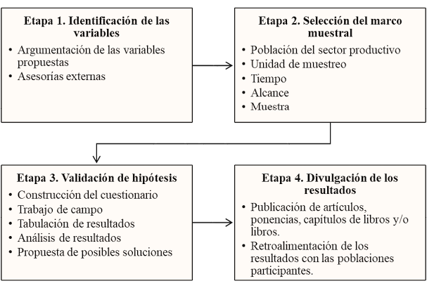 c. Abordaje metodológico: De carácter exploratorio y descriptivo, este estudio sigue una metodología cualitativa y cuantitativa apoyada en técnicas de recolección de datos apropiadas y en respuesta a la necesidad que la información recogida sea significativa. La metodología pretende cumplir con la operacionalización del modelo y evaluación de las variables, lo cual se propone a través de las siguientes etapas que se muestran en la Figura VI.
