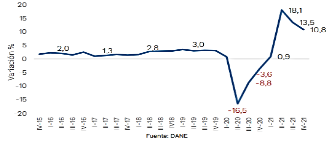 Otro de los indicadores importantes dentro de la economía colombiana es el desempleo. En el país, a pesar del aumento registrado del salario mínimo, el desempleo era de un 12,9% a nivel nacional hasta febrero de 2022. En materia de economía internacional, según Mincomercio (2022), después de los efectos económicos del COVID-19 el PIB en América Latina aumentó 6,8% en 2021, impactando positivamente el comercio exterior, dentro del cual Colombia presentó un 10,6%. En 2021, el PIB de Colombia creció 10,6%, que contrastó con la variación negativa de 7%, en 2020. Si se compara con 2019 (prepandemía) el PIB de 2021 fue superior en 2,8% (ver Gráfico I).