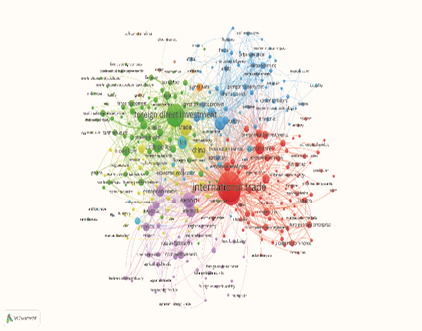 De los documentos extraídos se obtuvieron 5.778 palabras clave, de las cuales 334 cumplen con el criterio de un mínimo de 5 citaciones, con 8 clústeres (ver Figura III): Clúster 1: Productos derivados de la agricultura, inteligencia artificial, Big Data, Comercio electrónico, Riesgo, gobierno digital; Clúster 2: Impacto económico, acuerdos bilaterales, cambio estructural; Clúster 3: Medioambiente, Capital humano, Inversión; Clúster 4: Conglomerado, Macroeconomía; Clúster 5: Bloque económico, Exportación, regionalismo; Clúster 6: Co-integración, Intra-industria; Clúster 7: Datos de panel; y, Clúster 8: Condiciones económicas, crisis económica y stock de mercado.