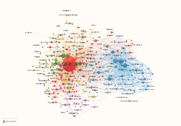 Estudios contemporáneos sobre la economía política demuestran la vigencia del tema en publicaciones científicas en bases de datos como Scopus. La bibliometría obtuvo 5.778 palabras clave de los documentos en Scopus, distribuido en 8 clústeres (ver Figura II).