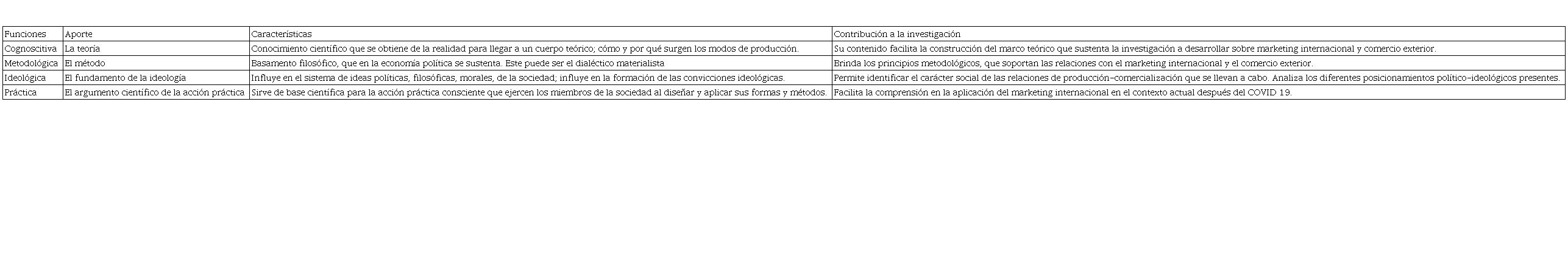 Específicamente, las funciones de la economía política (ver Cuadro 3) sirven de guía para el diseño del modelo como variables independientes, pero al mismo tiempo, capaces de incidir en los contextos en los cuales se desarrolle el marketing internacional en función del comercio exterior, permitiendo un análisis crítico y argumentado.