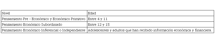 La educación financiera consiste en la capacidad de un individuo para obtener, comprender y evaluar la información relevante y necesaria para tomar decisiones con una conciencia de las probables consecuencias financieras (Mason y Wilson, 2000). Se considera que la educación financiera debiera iniciar desde la infancia, porque es allí donde las personas comienzan a tener una noción básica de lo que es el dinero, aunque este conocimiento se va a ir estructurando de acuerdo a la edad. Según el modelo de psicogénesis planteado por Denegri, Martínez y Etchebarne (2007); y, Aparicio (2014), este conocimiento varía de acuerdo a la edad en una escala de tres niveles como se muestra en el Cuadro 1.