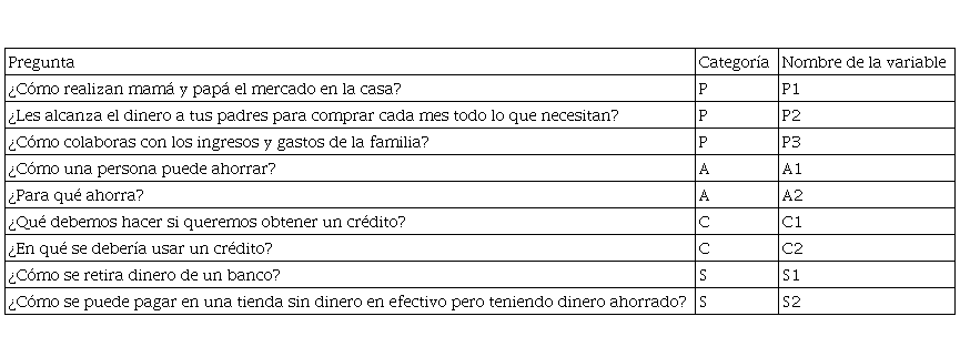 El instrumento que se utilizó para la recolección de datos, está compuesto por un formulario orientado a los niños, contentivo de nueve preguntas separadas por las cuatro categorías básicas de educación financiera tomadas del documento de la Estrategia Nacional de Educación Económica y Financiera del CIEEF (2017): P: Presupuesto; A: Ahorro; C: Crédito; y, S: Sistema financiero. El Cuadro 2, señala las preguntas del formulario, su categoría y las variables asignadas en el estudio.