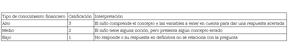 Estos resultados se pueden comparar con aquellos obtenidos de estudios similares, como el acometido por Cruz (2018), quien abordó este mismo tema y con niños de edades parecidas a los entrevistados en esta investigación, específicamente sobre una población estudiantil del sexto grado de primaria en cinco escuelas públicas de la zona metropolitana de Guadalajara, Jalisco, México, en la que concluye empíricamente que, por una parte, la familia se constituye en la influencia más importante en el conocimiento financiero de los niños y, por la otra, que se hace necesario insistir en la educación formal financiera como elemento fundamental en la consolidación de ese conocimiento.