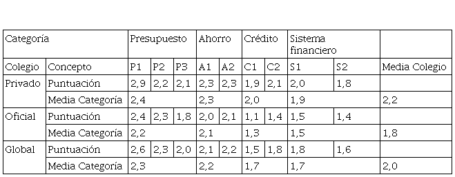 Los hallazgos revelan, entonces, un mayor conocimiento financiero en materia de presupuestos y de ahorros, que en los temas de créditos y sistema financiero, por cuanto las puntuaciones medias (sobre una máxima de 3,0) obtenidas en las cuatro categorías fueron 2,3; 2,2; 1,7; y 1,7 respectivamente, de conformidad con la última fila de la Tabla 4, que resume los resultados de los promedios mostrados en las tablas 5 y 6, y que revela además puntuaciones mayores en las cuatro categorías obtenidas por los niños del colegio privado.