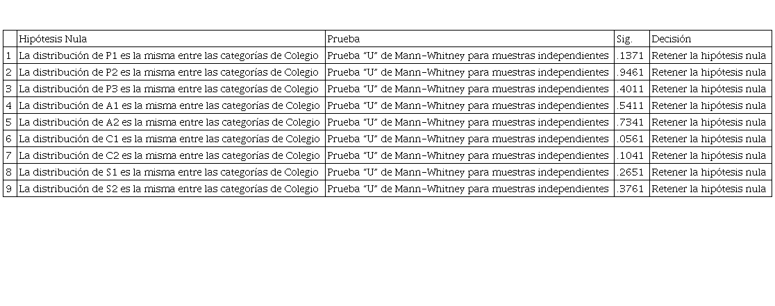 Para determinar la diferencia entre las respuestas de los estudiantes de colegios oficiales y no oficiales, se realizó una prueba no paramétrica U de Mann-Whitney. Las pruebas de medias de dos o más muestras se realizan para decidir si las medias de las poblaciones son iguales o si presentan diferencias significativas (López, 2013). Así, la hipótesis nula (H0) y la alternativa (H1) quedan formuladas como se muestra seguidamente.