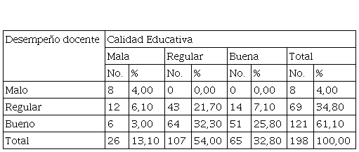 En esta sección se expone el tratamiento estadístico dado a los datos obtenidos en la investigación. La Tabla 1, muestra que el desempeño docente es calificado como Malo (4,00%), Regular (34,80%), y Bueno (61,10%); y la calidad educativa, es Mala (13,10%), Regular (54,00%), y Buena (32,80%), siendo que la razón cruzada de mayor peso entre las variables está en un desempeño bueno y una regular calidad educativa (32,30%). También se aprecia en la Tabla 2, la existencia de una correlación moderada y significativa entre las variables (Sp R = 0.365 y p<0,001).