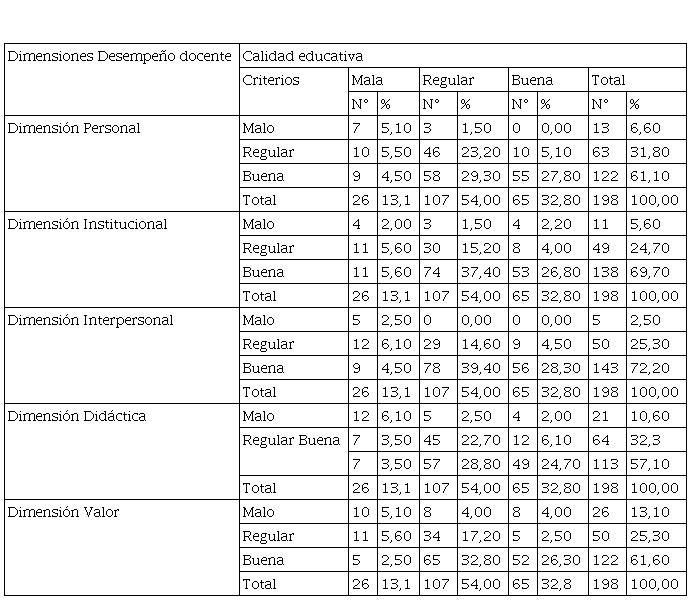 Por otra parte, la Tabla 3 evidencia los resultados porcentuales en función a las distintas dimensiones del desempeño docente y la calidad educativa, referentes al aspecto personal, los cuales el 27,80% percibe como buena; concerniente a lo institucional, el 26,80% la señala como buena; en relación a la dimensión interpersonal, 28,30% afirma que es buena; de igual manera, en la dimensión didáctica del docente, el 24,70% piensa que es buena; y en la dimensión valor, el 26,30% opina que es buena, los resultados expuestos hacen presumir que el fenómeno de la pandemia COVID-19 ha influido en el desempeño del docente, como consecuencia del cambio de una educación presencial a una modalidad virtual (Briceño et al., 2020).