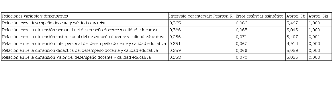 En este orden, se estableció que existe una relación moderada entre la dimensión personal del desempeño docente y la calidad educativa (Sp R = 0.396 y p<0,001); una relación moderada entre la dimensión institucional del desempeño docente con la calidad educativa (Sp R = 0.236 y p<0,05); una relación moderada entre la dimensión interpersonal del desempeño docente con la calidad educativa (Sp R = ,331 y p<0,001); una relación moderada entre la dimensión didáctica del desempeño docente con la calidad educativa (Sp R = 0.339 y p<0,001); y, finalmente, una relación moderada entre la dimensión valores del desempeño docente con la calidad educativa (Sp R =0.338 y p<0,001). Los coeficientes hallados tanto para el objetivo general y específicos demuestran que la relación entre todas ellas es moderada, con un nivel de significancia de 99%.