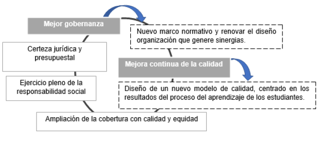 Lograr una nueva gobernanza del sistema de educación superior implica sumar las capacidades de las IES, las empresas, los distintos órdenes de gobierno, las legislaturas federales y estatales, así como todos los demás actores sociales, para dar un impulso inédito a la educación superior (ANUIES, 2018). En la Figura I, se observan los elementos para la gobernanza sistémica con el fin de alcanzar una mejora continua de la calidad entre los componentes que la integran, dejando de ser el sistema de educación superior un débil conglomerado de instituciones desarticuladas. Se deben reconocer los avances en la educación superior en materia de cobertura, gestión y financiamiento; pero a su vez, debatir lo que hace falta para adaptarse a la nueva modernidad.