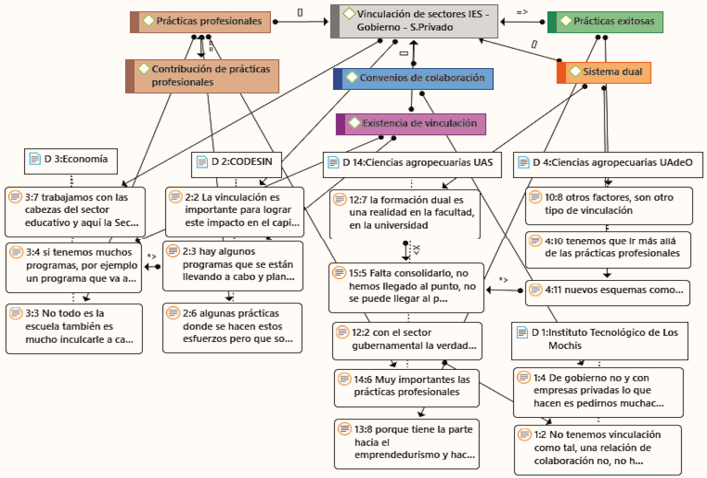 Los elementos de la gobernanza universitaria implican la vinculación entre los distintos sectores, donde se dan las prácticas profesionales, los convenios de colaboración y la implementación de prácticas exitosas, y muchas veces la ausencia de estas. Los entrevistados en las IES (directores y coordinadores de programas educativos – actores gubernamentales), manifiestan carencias en la consolidación de un sistema dual, para algunos está consolidado, pero otros reflexionan sobre la importancia de ir más allá de las prácticas profesionales, aunque una realidad es la falta de espacios en empresas para realizarlas y a su vez un motivo por lo cual ciertos programas no admiten más estudiantes.