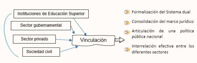 Finalmente, en los resultados se destaca la necesidad de establecer vínculos sólidos y específicos, entre instituciones de educación superior, empresas, gobierno y sociedad civil, en aras de afrontar las condiciones que impone la nueva modernidad, con base en las recomendaciones de organismos internacionales, buscando consolidar un sistema de formación dual, en donde teoría y práctica se integren como una constante de la gobernanza en la educación superior.