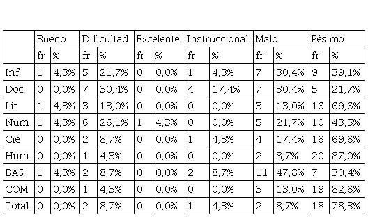 Es decir, los jóvenes recién ingresados tienen serias dificultades de comprensión frente a textos con tematización informativa, literaria y científica. Aunque no era teóricamente esperado, parecen más difíciles los textos humanísticos que los textos literarios. Los resultados totales agrupan a los lectores en el nivel pésimo (93,30%) dispersándose sólo hacia las categorías inmediatas superior: Dependiente malo (6,70%). Sólo una persona llega al nivel de dependiente instruccional en textos documentarios.