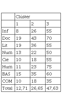 De igual manera, se realizó un análisis Clúster para identificar los agrupamientos de las competencias lectoras en los sujetos con respecto a los textos. Se puede observar en la Tabla 9 tres agrupamientos de resultados. En ese sentido, el Clúster 3 tiende a rendir en general a un nivel dependiente instruccional en los textos básicos, y a un nivel de deficiente malo en los textos complementarios. El Clúster 1 y 2, rinden en general al nivel de deficiente malo en los textos básicos, y de deficiente pésimo en los textos complementarios.