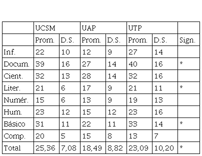 En la Tabla 10, se presentan los promedios, desviación estándar (DS), y diferencias significativas de las muestras. Se observa que la Universidad Católica de Santa María, es la que tiene los mejores resultados; seguido de la Universidad Tecnológica del Perú; y finalmente, la Universidad Alas Peruanas.