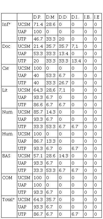 De igual forma, en la Tabla 7 se presentan en frecuencia y porcentajes de frecuencia los sujetos de la población universitaria de Arequipa-Perú clasificados en las categorías de competencia lectora propuestas en la Tabla 1. En ese sentido, los resultados de la Universidad Católica de Santa María señalan que hay sólo tres lecturas con altísimos porcentajes en el nivel de pésimo (literario, científico e informativo); lo mismo se refleja en total con 66,70% en pésimo. Las frecuencias en los textos básicos se acumulan en lectores dependientes pésimos (53,34%); y, en los textos complementarios en deficiente-pésimo (100%). Es decir, los jóvenes recién ingresados tienen serias dificultades de comprensión frente a textos con tematización informativa, científica y literaria. Los resultados totales agrupan a los lectores en el nivel deficiente pésimo (66,70%) dispersándose sólo hacia las categorías inmediatas superior: Malo con 33,33%.