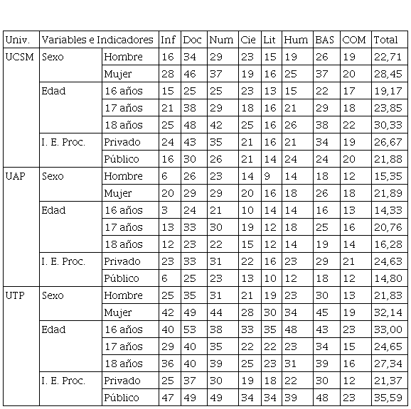 La investigación muestra que el nivel de comprensión lectora inferencial en los tres casos es “deficitario”, observándose que los estudiantes solo llegan a comprender, inferencialmente, alrededor del 30% de un texto. Investigaciones similares han alcanzado resultados parecidos, identificando que los estudiantes de recién ingreso tienen un nivel muy bajo de comprensión lectora (Ugarriza, 2006; Velásquez, Cornejo y Roco, 2008).