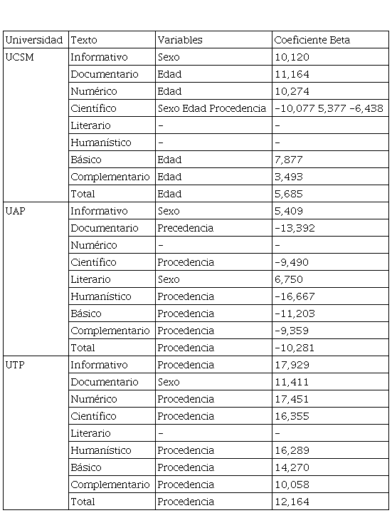 Y, en el caso de la Universidad Tecnológica del Perú, se observa que la variable sexo con sus dos valores hombre y mujer, tiene diferencias significativas en todos los textos, favorables a las mujeres con puntuaciones más altas. Así mismo, otras variables como edad y colegios de procedencia también presentan diferencias significativas en todos los textos destacando la edad de 16 años. En cuanto a colegios de procedencia, los colegios públicos tienen un mayor porcentaje en todos los tipos de textos (ver Tabla 2).