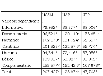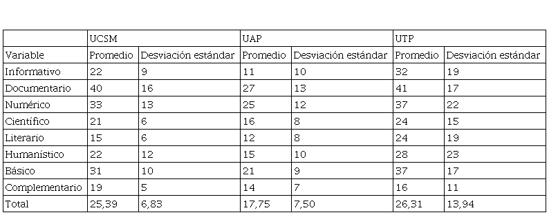 De igual manera, la matriz de correlaciones que se observa en la Tabla 5, muestra que la correlación es muy alta y significativa en los tres casos, especialmente en dos de sus valores. En el caso de la Universidad Católica de Santa María, las correlaciones “texto total” con “textos básicos” (0.955) y “documentarios” con “total” que son de 0.86. En tanto, en la Universidad Alas Peruanas, las correlaciones “texto total” con “textos básicos” (0.941) y “documentarios” con “total” que son de 0.86.
