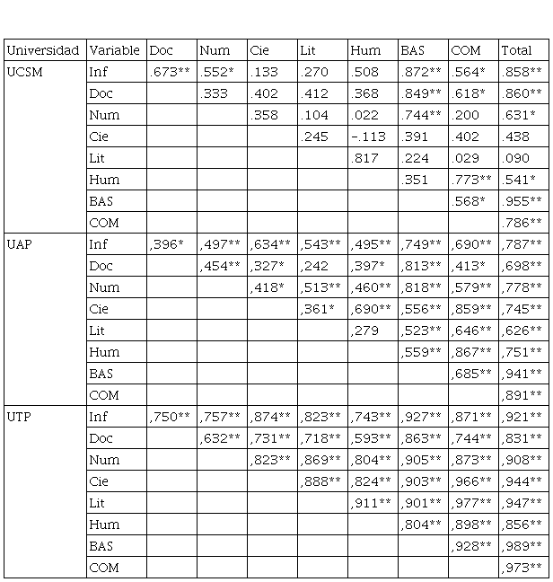 Por su parte, en la Universidad Tecnológica del Perú, las correlaciones “complementario” con “textos Iliterarios” (0.966) y “básico” con “total” que son de 0.989, dato que apunta a la validez de la prueba. En los tres casos los datos presentados perfilan a mostrar la validez de la prueba.