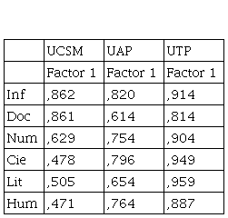Asimismo, se realizó el análisis factorial de los rendimientos textuales (ver Tabla 6). Como se observa, dicho análisis determina en los tres casos, un solo factor verbal que explica el 56,77% de la varianza total en el caso de la Universidad Católica de Santa María; mientras que, en lo concerniente a la Universidad Alas Peruanas, es de 54,374%; y en la Universidad Tecnológica del Perú de 87,129%. Estos datos verifican la validez de constructo del método de exploración empleado.
