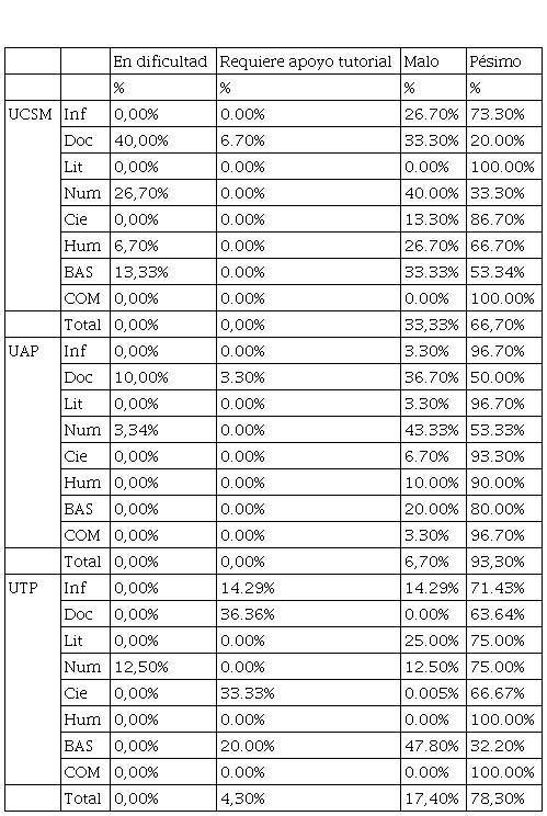 En suma, los resultados y conclusiones del estudio mostrado no escapan a los de otros autores y se inserta también como un documento probatorio de las deficiencias en el sistema educativo superior universitario y dentro de la misma problemática latinoamericana.
