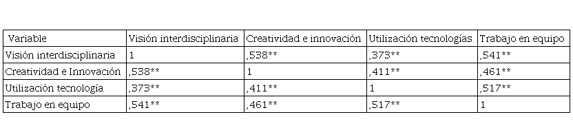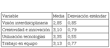 De acuerdo a los resultados descriptivos, se observa que la competencia más desarrollada es la de utilización de tecnologías (3,35 de media) y la menos desarrollada es la visión interdisciplinaria (2,85 de media). El modelo para el procesamiento de datos que se seleccionó es la regresión multivariante, utilizando el software SPSS. En la siguiente Tabla 1 se presentan tales resultados.