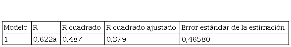 De igual manera, en la Tabla 2 se muestra el resumen del modelo en la cual se observa que el valor de R = 0.622 y el valor de R2 = 0,487, siendo valores aceptables para el modelo, y que la regresión como método es adecuado para examinar las hipótesis planteadas.