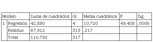 En la Tabla 3, se observa el análisis de varianza (anova), en la cual la significancia estadística es 0.000 por lo que la regresión contiene al menos una variable significativa, por lo cual, el modelo cumple con los supuestos del análisis realizado.