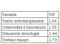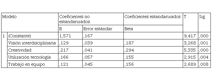 En la Tabla 4, se muestran los coeficientes en la cual se puede observar que la variable visión interdisciplinaria, tiene una significancia de 0.001; la variable creatividad, evidencia una significancia de 0.000; la variable utilización de tecnológica, tiene una significancia de 0.004; y, la variable trabajo en equipo, presenta una significancia de 0.008.