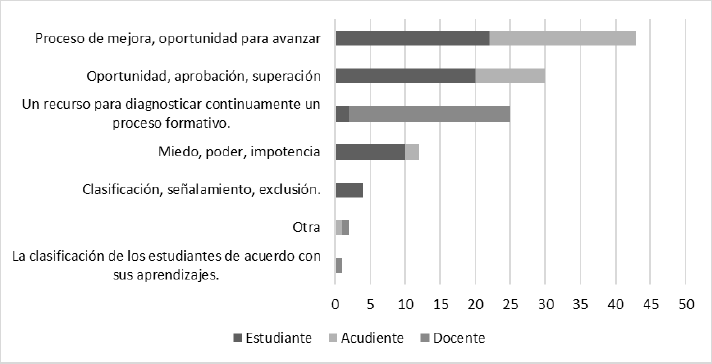 De acuerdo con la información reflejada en la Figura I, la evaluación asume un lugar común para todos los actores de la comunidad educativa; el cual se asocia como proceso de mejora y avance. No obstante, se asumen otros matices que denotan la prevalencia de prácticas utilitaristas. Por ejemplo, para un 7% de los estudiantes representa clasificación, señalamiento, exclusión; y el 40% de ellos, más el 6% de los padres de familia, lo relacionaron con miedo, poder e impotencia.