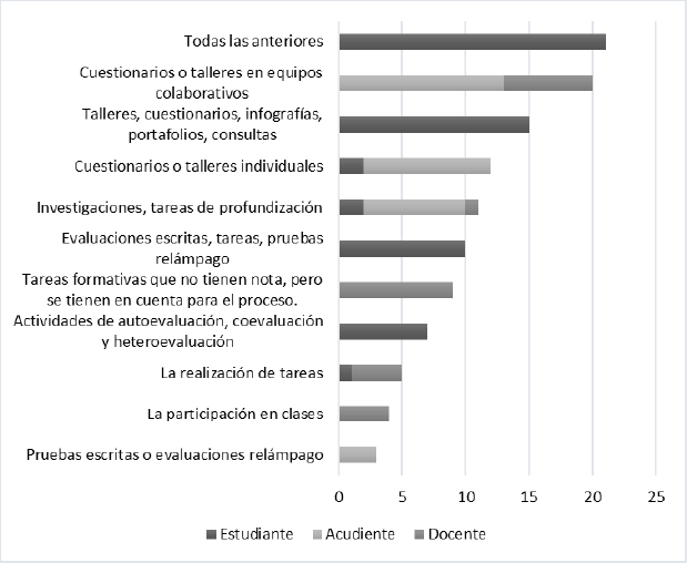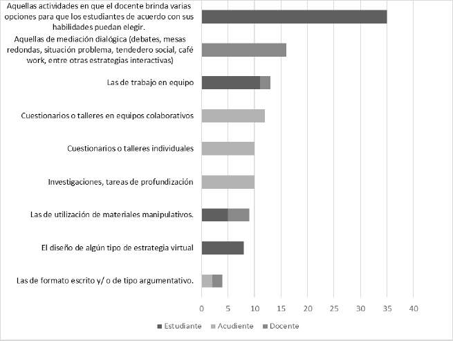 Asimismo, la mayor parte de los docentes (64%) considera que son todas aquellas de mediación dialógica: Debates, mesas redondas, situación problema, coffee work, tendedero social, entre otras. Y los estudiantes, en su mayoría (60,3%), manifestaron que son las que les brindan opción de elegir entre varias alternativas para evidenciar su avance en el aprendizaje de acuerdo a sus habilidades.