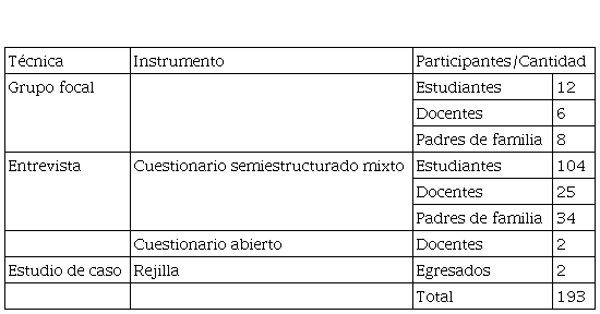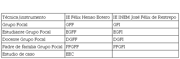 La investigación no partió de una cantidad determinada de participantes, sino de la preselección de voluntarios pertenecientes a los grados 9°, 10° y 11°, por tener una trayectoria experimental con diversas metodologías y estrategias evaluativas durante su proceso formativo. No obstante, se vincularon en el proceso un total de 116 estudiantes. De la misma manera, se nutrió la investigación desde los aportes y percepciones de 42 padres de familia, en su mayoría de la Institución Educativa Félix Henao Botero y otros pertenecientes a la Institución Educativa (IE) INEM José Félix de Restrepo. En el siguiente Cuadro 1, se condensa la representación de la población focalizada en los distintos momentos de recolección de la información, así como las técnicas e instrumentos que fueron aplicados en cada una de las IE.