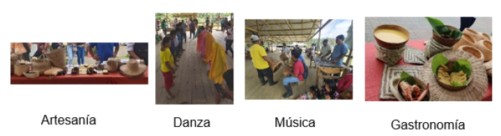 Las manifestaciones culturales presentes en esta comunidad ancestral son: La fiesta tradicional Chachi, artesanía, danza, música y gastronomía (ver Figura III), las cuales son de tipo acervo cultural y popular. Todas ellas demuestran la riqueza ancestral desde la etnología, la cultura y los valores antropológicos. Es importante destacar, que la fiesta tradicional Chachi se desarrolla cada año para celebrar la fecha de fundación, y en el mes de diciembre se ejecuta la fiesta navideña para la llegada del Niño Jesús, teniendo como centro la capilla, y contando con la asistencia de alrededor de mil personas. Durante esta actividad, la bebida, el cigarrillo, la chica de maíz y el perfume, son de consumo gratis, demostrando la fraternidad, el valor comunitario y la sensibilidad, el valor, respeto y cuidado hacia el prójimo.