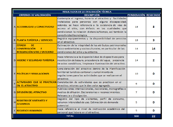 Desde lo turístico, la metodología fue tomada del manual de atractivos turísticos, diseñado por el Ministerio de Turismo del Ecuador (MINTUR, 2018) por ser un instrumento técnico que permite orientar y normar los inventarios de atractivos turísticos en el Ecuador, y puede ser tomado como modelo para otros espacios en la región y el mundo, debido a sus aportes de homologación conceptual y jerarquización a través de la ficha, presentada en formato Excel, cuantificándose en los siguientes rangos: 100-76, 75-51, 50-26, 25-11, y 10-0, y estableciendo la jerarquía del recurso en el nivel: I, II, II o IV.