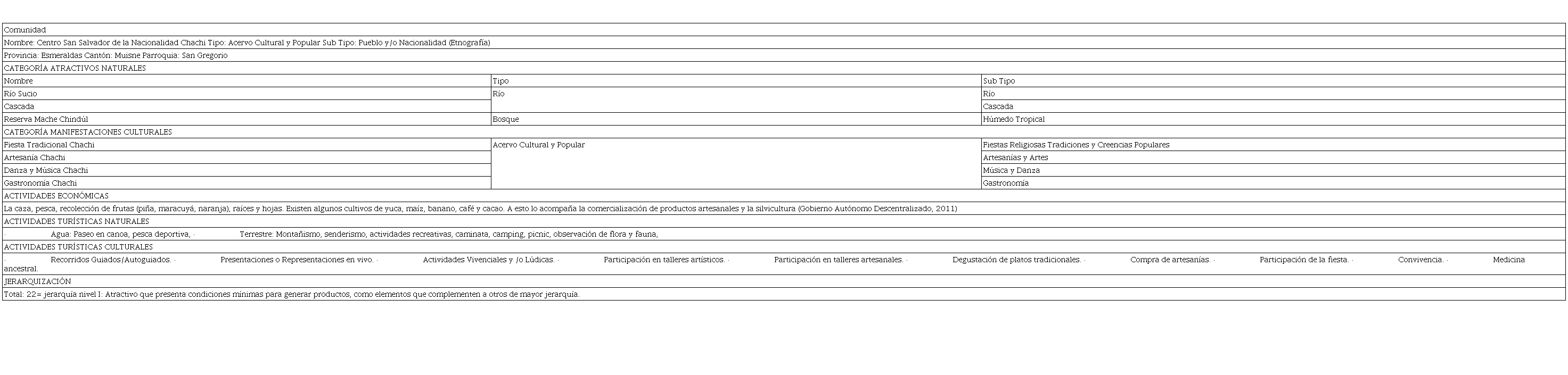 Reconocer la importancia de un destino turístico se materializa con el levantamiento y posterior jerarquización del área, específicamente la de San Salvador, la cual es identificada como comunitaria de características aborigen, siendo relevante para todos los involucrados; y desde lo investigativo, es notoria la riqueza como fuente de información, visto desde un nuevo modelo socio cultural, donde la actividad turística se presenta como una fuente sostenible para la económica de la localidad, desde el sentido de asociatividad, considerando los siguientes criterios: Categorías otorgadas en el ámbito natural: Reserva Ecológica Mache-Chindúl; categorías otorgadas en el ámbito cultural, normativa de planificación existente según jurisdicción territorial, cercanía geográfica a la costa ecuatoriana, Cantón Muisne y Cantón Pedernales; y conectividad con la provincia de Esmeraldas y Manabí.
