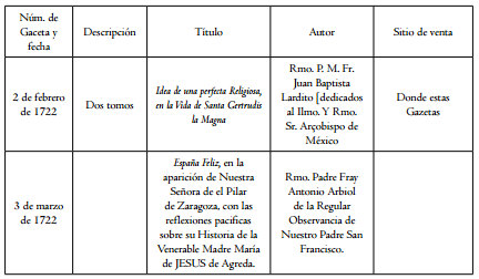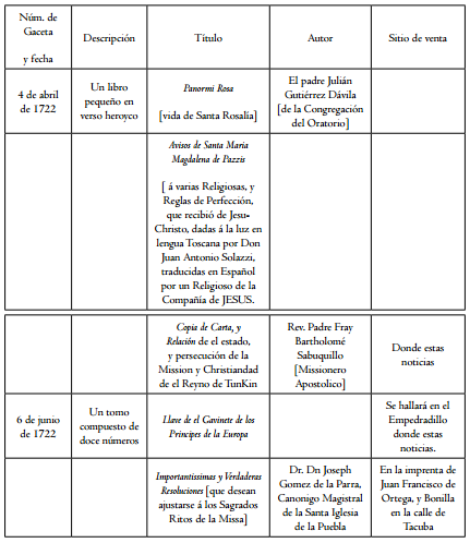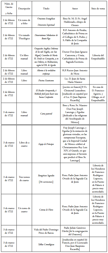 Aunque el número de registros relacionados con las novedades bibliográficas es breve como la existencia misma de la gaceta, algunos de los títulos anunciados se podían adquirir en la imprenta de los herederos de la viuda de Miguel de Ribera Calderón, ubicada en la calle del Empedradillo, justo al lado poniente de la Catedral; lo mismo que en la Librería de los Herederos de Francisco Rodríguez Lupercio, en el costado sur del Palacio Real, en “el puente de Palacio”, o en la imprenta de Juan Francisco de Ortega y Bonilla, en la calle de Tacuba. Por los títulos ofertados sabemos que los temas predominantes son de corte religioso. La tendencia se confirma con el conjunto de libros registrados en el cajón de Pérez del Campo, donde 43% pertenecen a ese género, seguidos de los temas históricos, legales, literarios y, en menor medida, científicos (García y Montiel, 2010: 99).