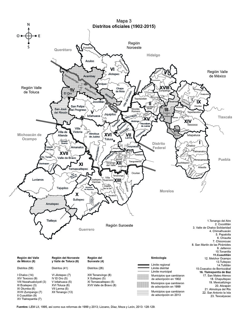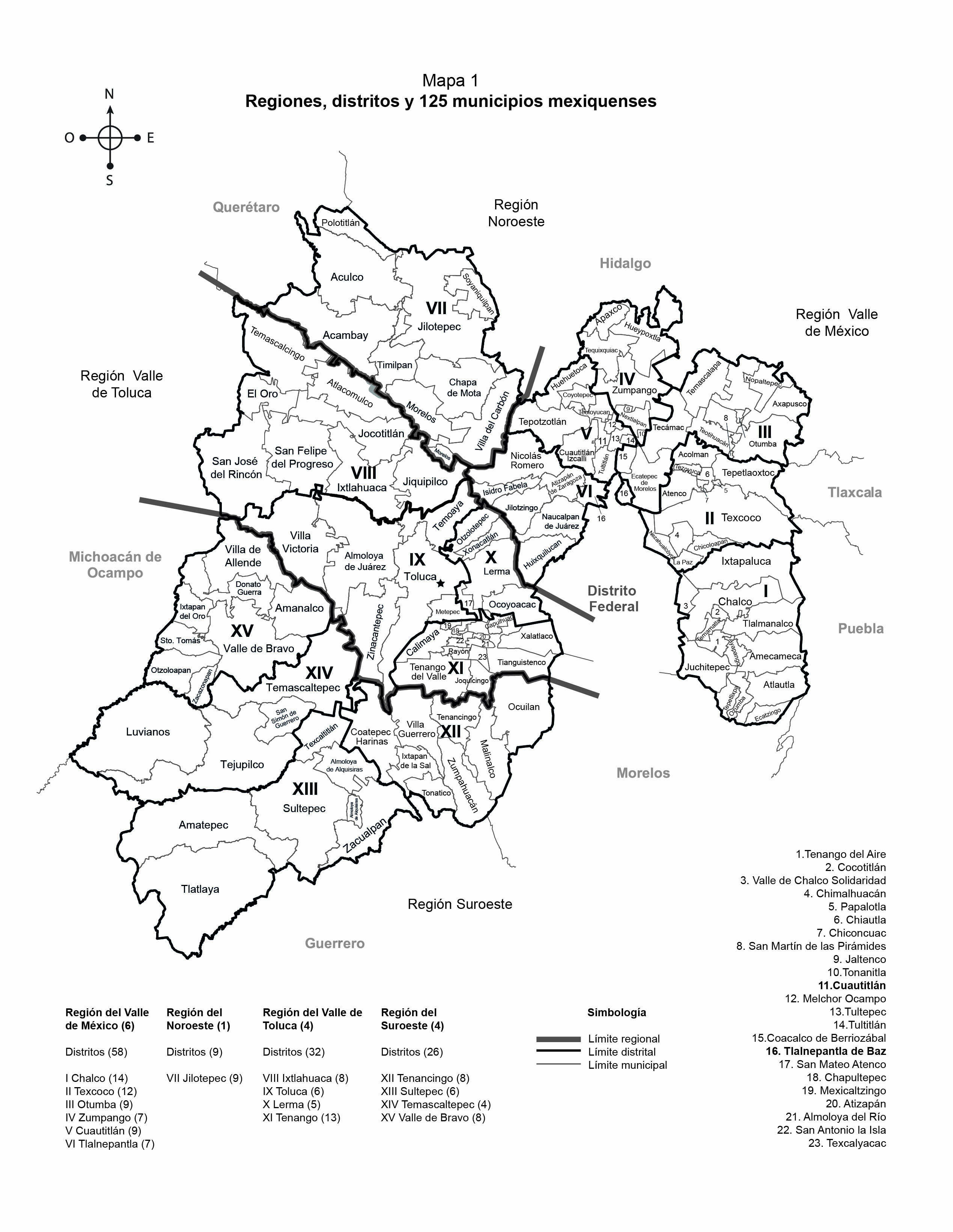 Como se observa en el mapa 1, dividimos el Estado de México en cuatro regiones —Valle de México, Noroeste, Valle de Toluca y Suroeste— y 15 distritos. Tanto las regiones como los distritos son ordenados de acuerdo con su ubicación espacial. Valle de México forma parte en su totalidad de la ZM del Valle de México, se divide en seis distritos (Chalco, Texcoco, Otumba, Zumpango, Cuautitlán y Tlalnepantla), se extiende sobre 27% del territorio estatal y sirve de hábitat al 69% de los mexiquenses. Valle de Toluca se divide en cuatro distritos (Ixtlahuaca, Toluca, Lerma y Tenango del Valle), se extiende sobre 25% del territorio estatal y contiene al 18% de los mexiquenses, los cuales residen mayoritariamente en la ZM del Valle de Toluca. El Suroeste, que también está conformado por cuatro distritos (Tenancingo, Sultepec, Temascaltepec y Valle de Bravo), es la región más extensa del Estado de México (35%), pero su población (10%) solo es superior a la del Noroeste, en cuyo único distrito (Jilotepec), que abarca 13% del territorio estatal, vive 2% de los mexiquenses.