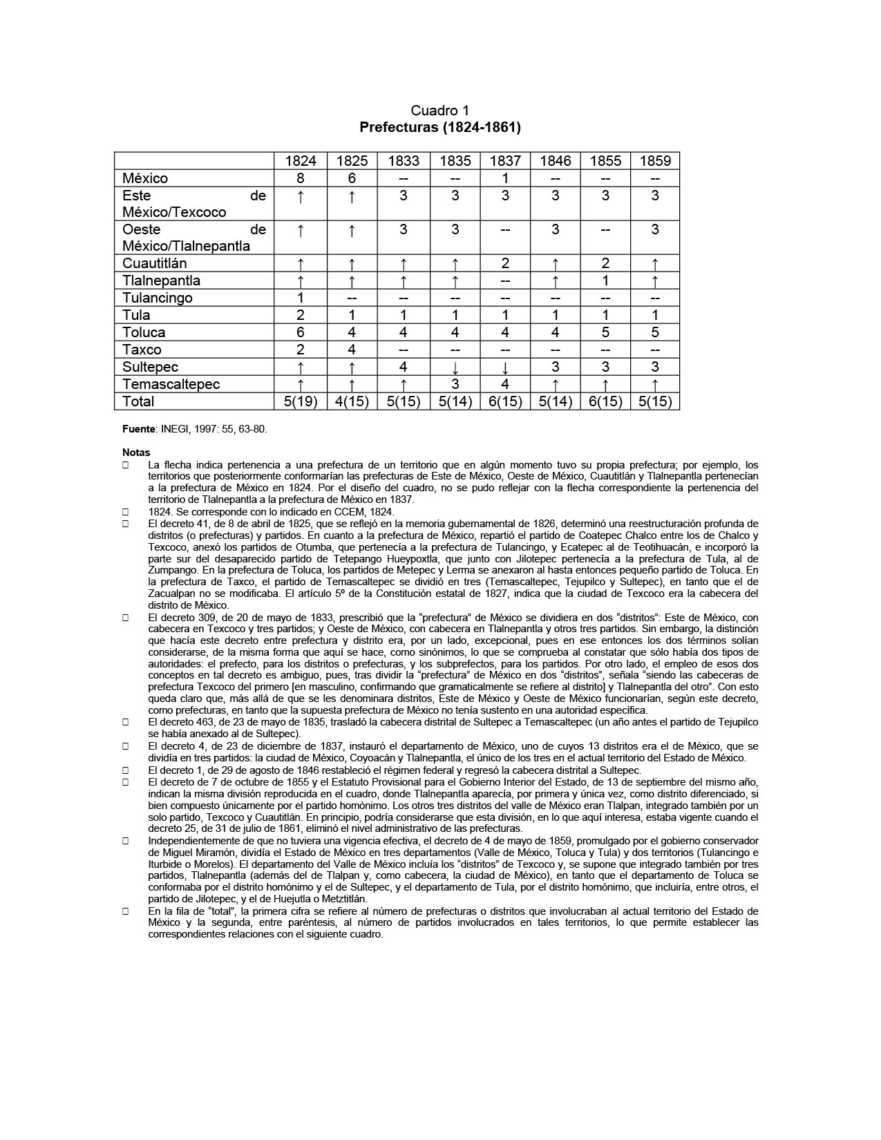 Durante las casi cuatro décadas de existencia de las prefecturas, sus principales cambios respecto a creaciones, supresiones y traspasos de Einis completas, a partir de abril de 1825, ocurrieron en el Valle de México, donde el número de prefecturas osciló entre una y tres, y, en menor grado, en el Suroeste. En el Valle de México hubo una sola prefectura, con cabecera en Texcoco, hasta 1833. A partir de entonces, esta prefectura permanecería dividida. La parte oriental de este valle siempre se mantuvo integrada en una sola prefectura compuesta de tres partidos, independientemente de que se llamara Este de México o con el nombre de su cabecera, Texcoco. Sin embargo, los tres partidos de la porción occidental del valle solo en ocasiones reprodujeron una situación similar a la anterior, con los nombres de Oeste de México o Tlalnepantla, pues en otras ocasiones Cuautitlán y Zumpango formaron su propia prefectura, con cabecera en Cuautitlán, en tanto que el partido de Tlalnepantla bien quedaba integrado en la prefectura de México (1837-1846) bien conformaba por sí solo una prefectura, como sucedió desde 1855. La prefectura más vinculada con la región del Suroeste, que nunca incluyó el partido de Tenancingo ni una porción relevante del de Valle de Bravo, fue inicialmente muy extensa y tuvo su cabecera en Taxco, pero en 1833 se segregó de la anterior la parte correspondiente al actual territorio del Estado de México, la cual alternaría su cabecera entre Sultepec (1833-1835, 1846-1861) y Temascaltepec, en 1835-1846. No obstante, algunos de los traspasos de UM, que se analizan al referirnos a las Einis, demuestran que los territorios de las prefecturas fueron más cambiantes de lo que indican los datos anteriores. Por un lado, los cambios de adscripción de Eini de dos municipalidades del Valle de México (Tultilán, entre 1835 y 1849, y Ecatepec, entre 1854 y 1862) afectaron las extensiones de las prefecturas de Texcoco, Tlalnepantla y Cuautitlán. Por otro lado, tanto la división del partido de Zacualpan en 1837, por más que se revirtiera en 1846, como la transferencia en 1849 de la municipalidad de Villa del Valle del partido de Temascaltepec al de Toluca, afectaron, en el primer caso transitoriamente y en el segundo definitivamente, los límites entre las prefecturas de Toluca y Sultepec/Temascaltepec.