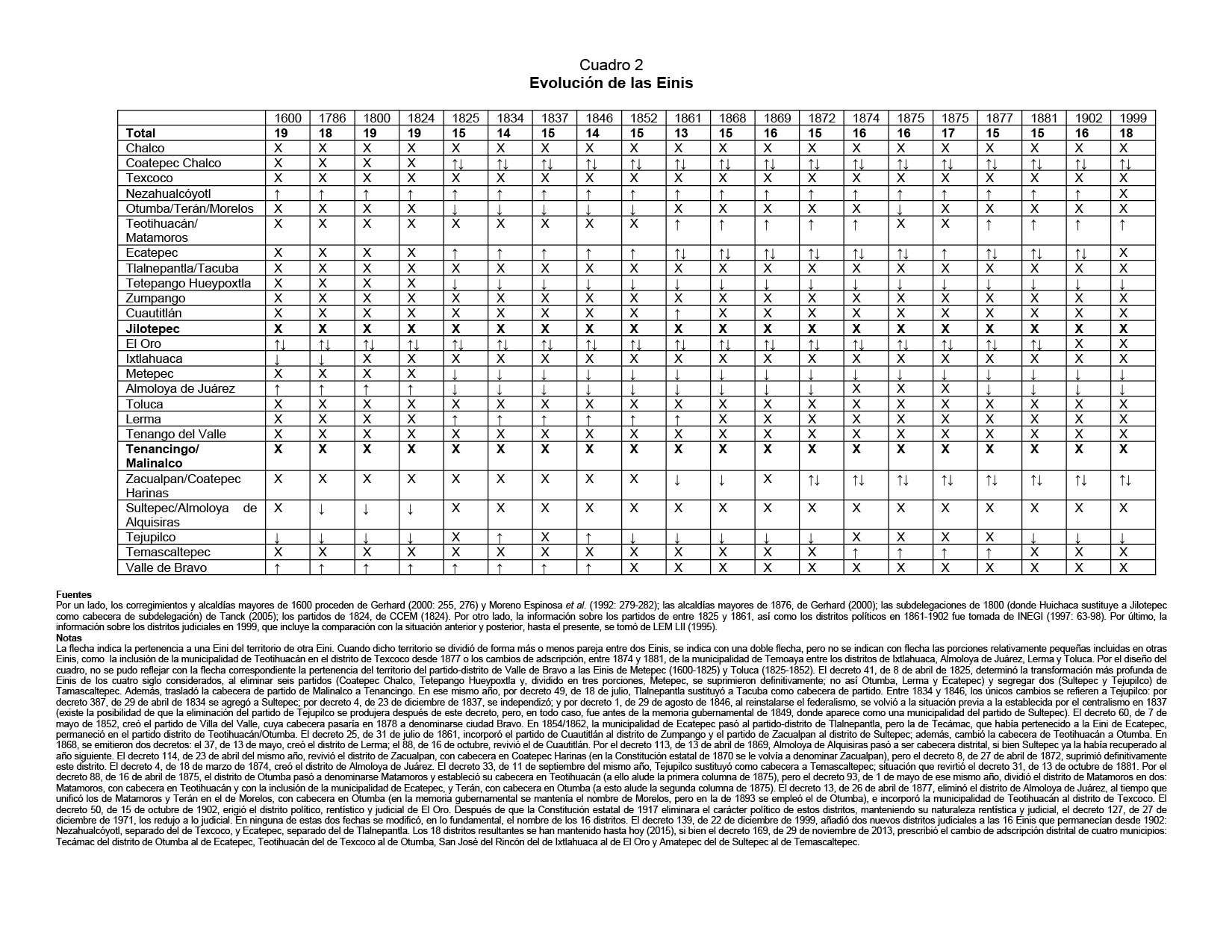 La primera conclusión se evidencia al detectar tanto el origen de las cabeceras de los actuales distritos judiciales como la vigencia actual de las cabeceras de las Einis de 1600.19 La permanencia reflejada por estas dos comparaciones se debe a que las transformaciones de 1824-1825, pese a su profundidad, no afectaron a buena parte de la división territorial previa y a que algunas de ellas, así como otras ocurridas décadas después, fueron revertidas con el correr de los años. Por un lado, las 18 cabeceras de distrito judicial de hoy podrían clasificarse en tres grupos de acuerdo con sus orígenes y permanencias. Doce, las dos terceras partes, fueron cabeceras de Eini al final del siglo XVI: seis lo han sido ininterrumpidamente desde entonces (Chalco, Texcoco, Zumpango, Jilotepec, Toluca y Tenango del Valle) y seis con interrupciones más (Ecatepec) o menos (Otumba, Cuautitlán, Lerma, Sultepec y Temascaltepec) breves. Cinco cabeceras han tenido una existencia ininterrumpida de entre dos siglos y un siglo: tres de alrededor de dos siglos (Tlalnepantla, Ixtlahuaca y Tenancingo), Valle de Bravo de siglo y medio y El Oro de poco más de una centuria. Por tanto, solo una de las actuales cabeceras de distrito judicial, Nezahualcóyotl, tiene una antigüedad menor a un siglo. Por otro lado, de las 19 cabeceras de Einis existentes al final del siglo XVI, las 12 mencionadas antes en primer lugar siguen siéndolo hoy, mientras cinco dejaron de serlo definitivamente alrededor de 1825 (Coatepec Chalco, Hueypoxtla, Tacuba, Malinalco y Metepec), al tiempo que Teotihuacán y Zacualpan continuaron siéndolo hasta varias décadas después. Sin embargo, si a las 12 cabeceras del final del siglo XVI que son hoy cabeceras de distritos judiciales se añaden los distritos que habiendo cambiado su cabecera existen hoy con una extensión similar a la que presumiblemente tenían al final del siglo XVI, el número de distritos judiciales actuales con orígenes en ese momento se incrementaría a 14, al añadir Tlalnepantla, cuya cabecera fue Tacuba hasta que esta municipalidad pasara a engrosar el Distrito Federal mediante el decreto 49 del 18 de julio de 1825,20y Tenancingo, cuya cabecera fue Malinalco también hasta 1825.